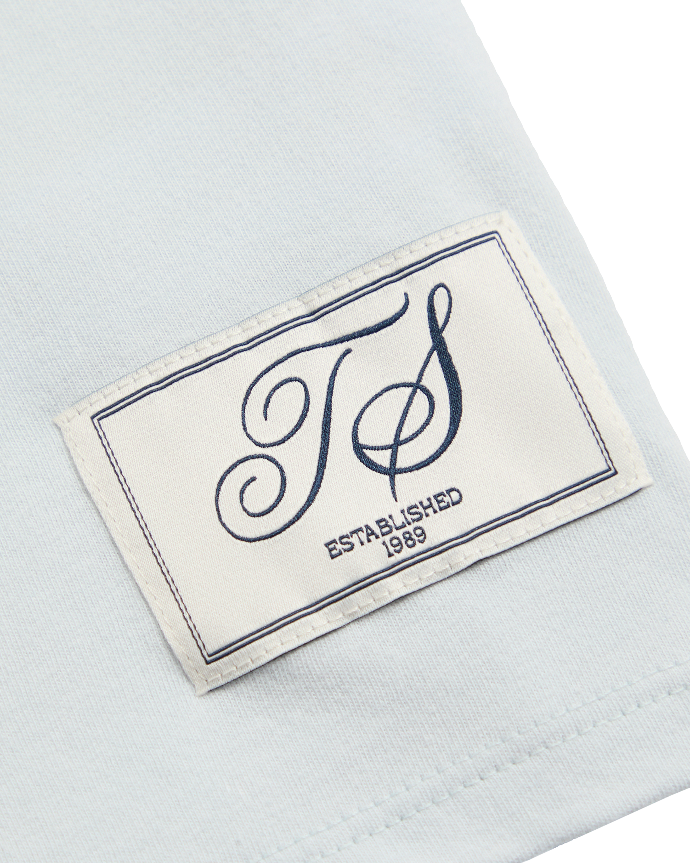 Sky blue boxy t-shirt featuring seagull and sun design and cherry lips. crystal skies song lyrics printed on front with TS Established 1989 woven label affixed to wearer’s left hem.