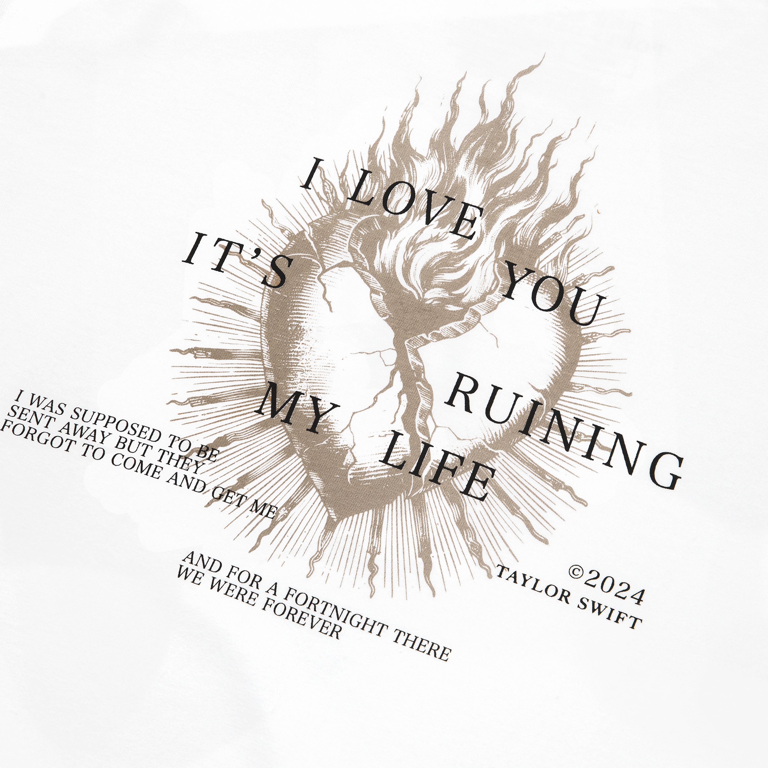 White t-shirt featuring TTPD album logo and The Tortured Poets Department printed on front with a heart and flames design. I Love You It’s Ruining My Life song lyrics. I Was Supposed To Be Sent Away But They Forgot To Come And Get Me song lyrics. And For A Fortnight There We Were Forever song lyrics. and ©2024 Taylor Swift printed on back.
