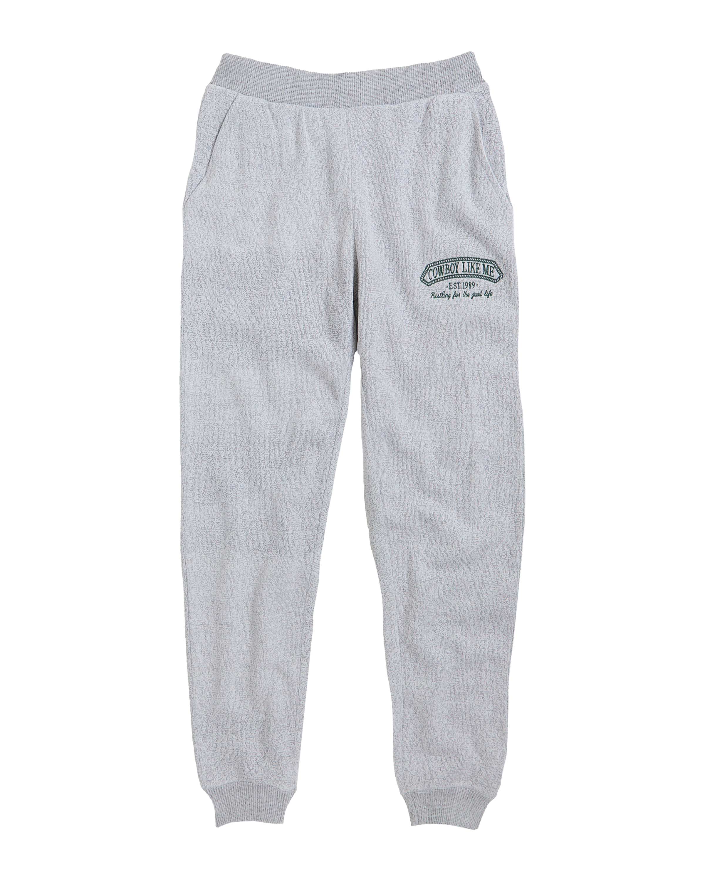 Gray plush textured knit joggers with elastic waist and side pockets featuring Cowboy Like Me song title and Est. 1989 with Hustling for the good life song lyrics embroidered on wearer’s front left leg.