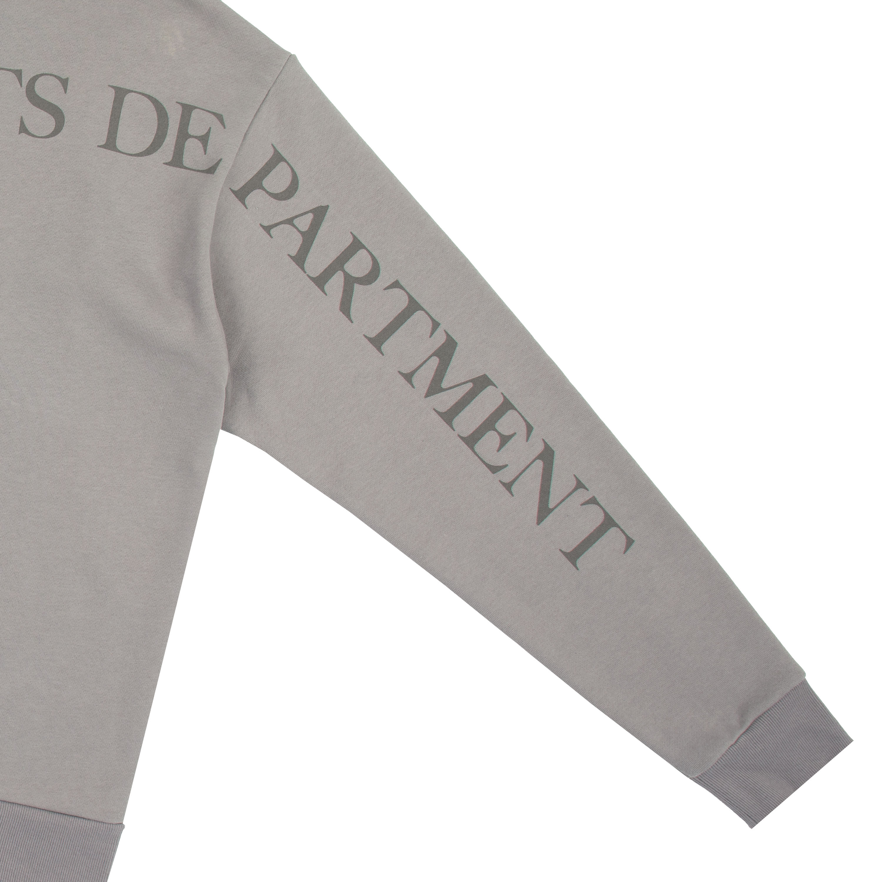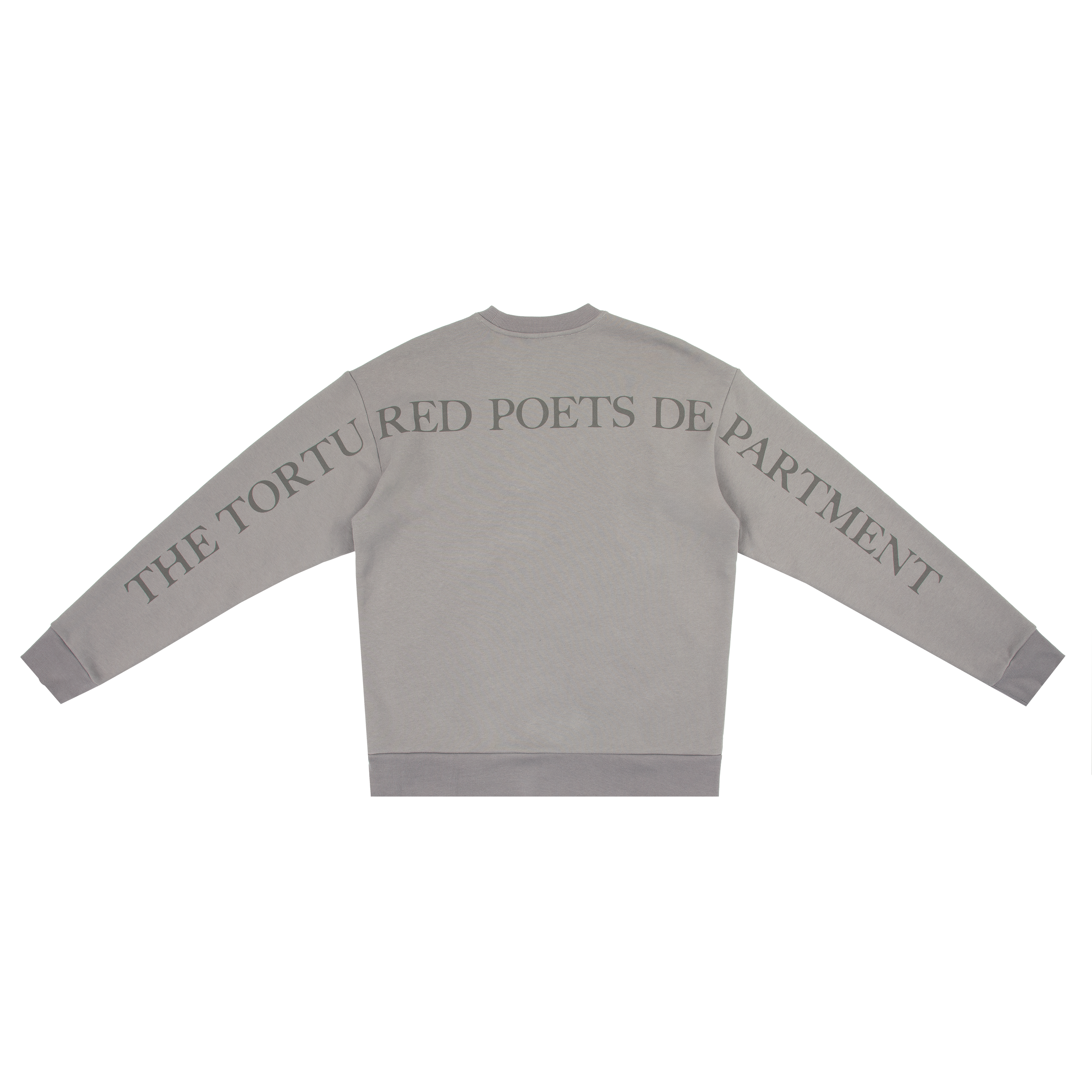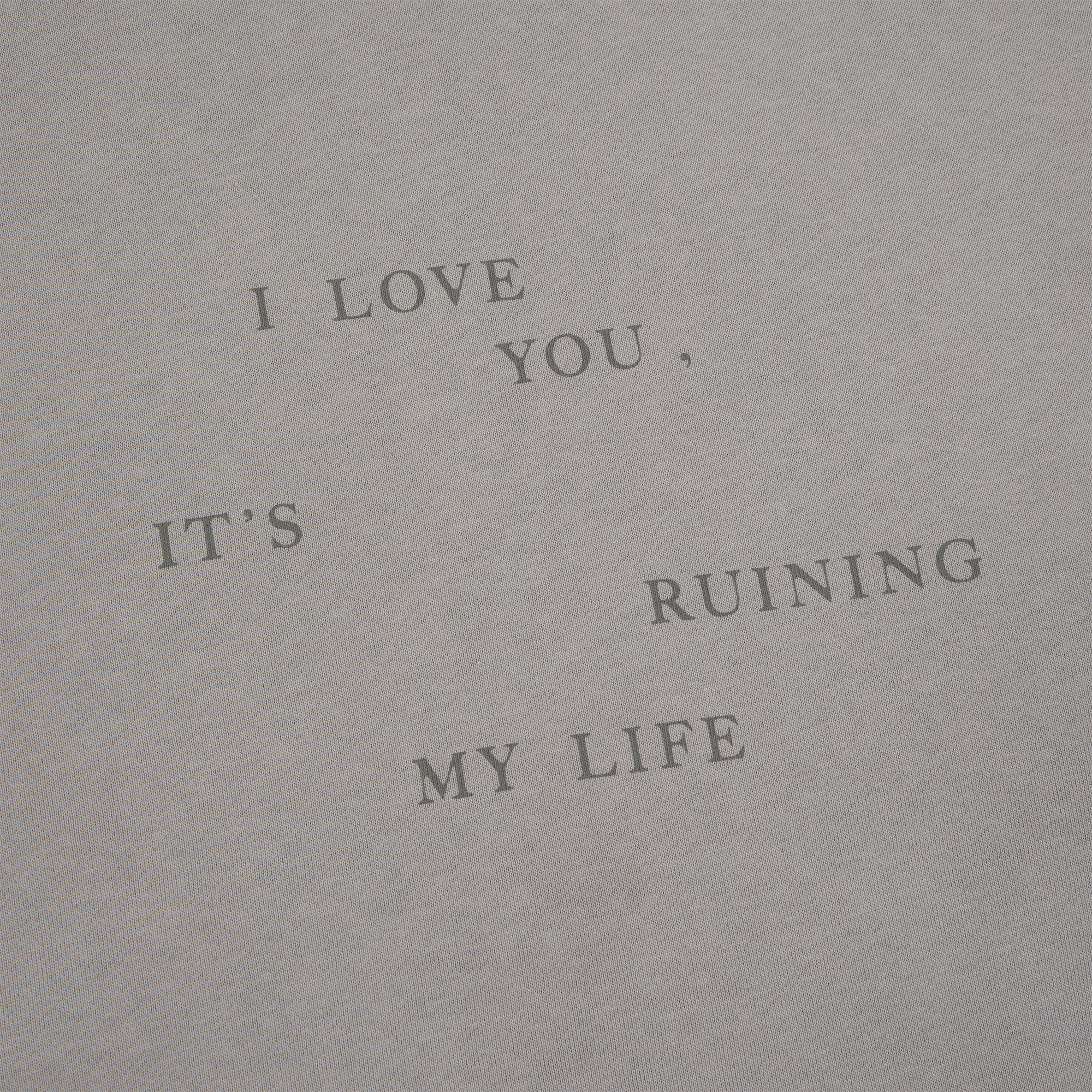 Gray crewneck featuring I Love You It’s Ruining My Life song lyrics printed on front with The Tortured Poets Department printed on back and down both sleeves.