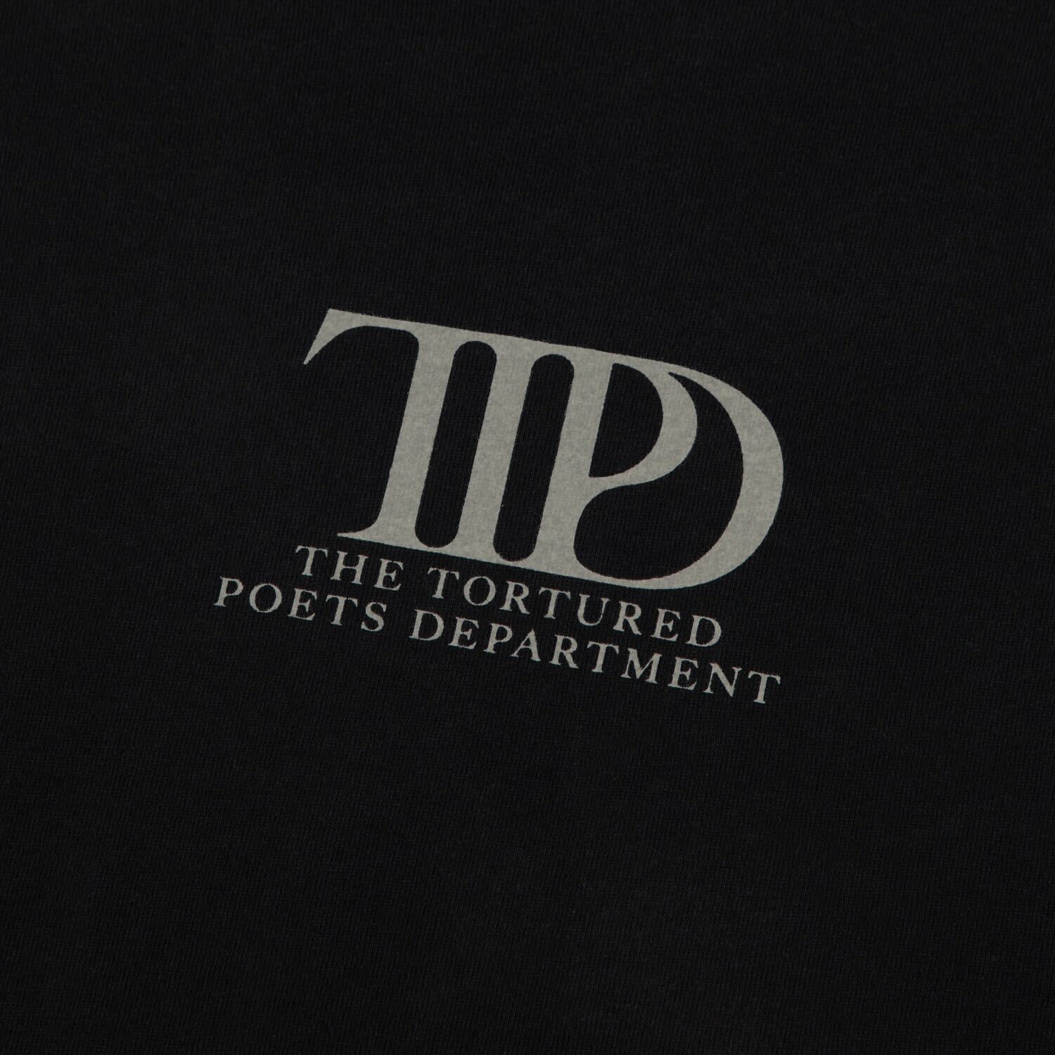 Black t-shirt featuring TTPD album logo and The Tortured Poets Department printed on front with space ship design. Now I’m Down Bad. song lyrics. Taylor Swift. and For A Moment I Knew Cosmic Love and other Down Bad song lyrics printed on back.