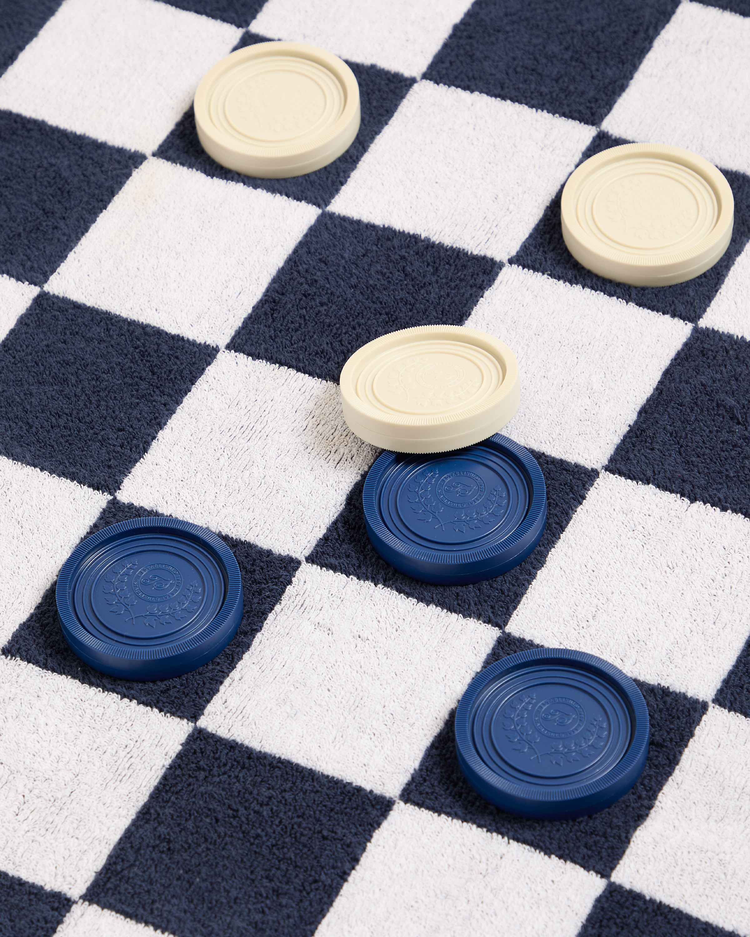 Taylor Swift Towel Game Set featuring TS Established 1989 crest logo. Taylor Swift. You Play Stupid Games You Win Stupid Prizes song lyrics. Established 1989 and checkerboard design woven on front. Features 24 custom 3 navy and cream plastic embossed checkers with TS established 1989 crest logo packaged in a navy strap with netting bag featuring Taylor Swift woven label.