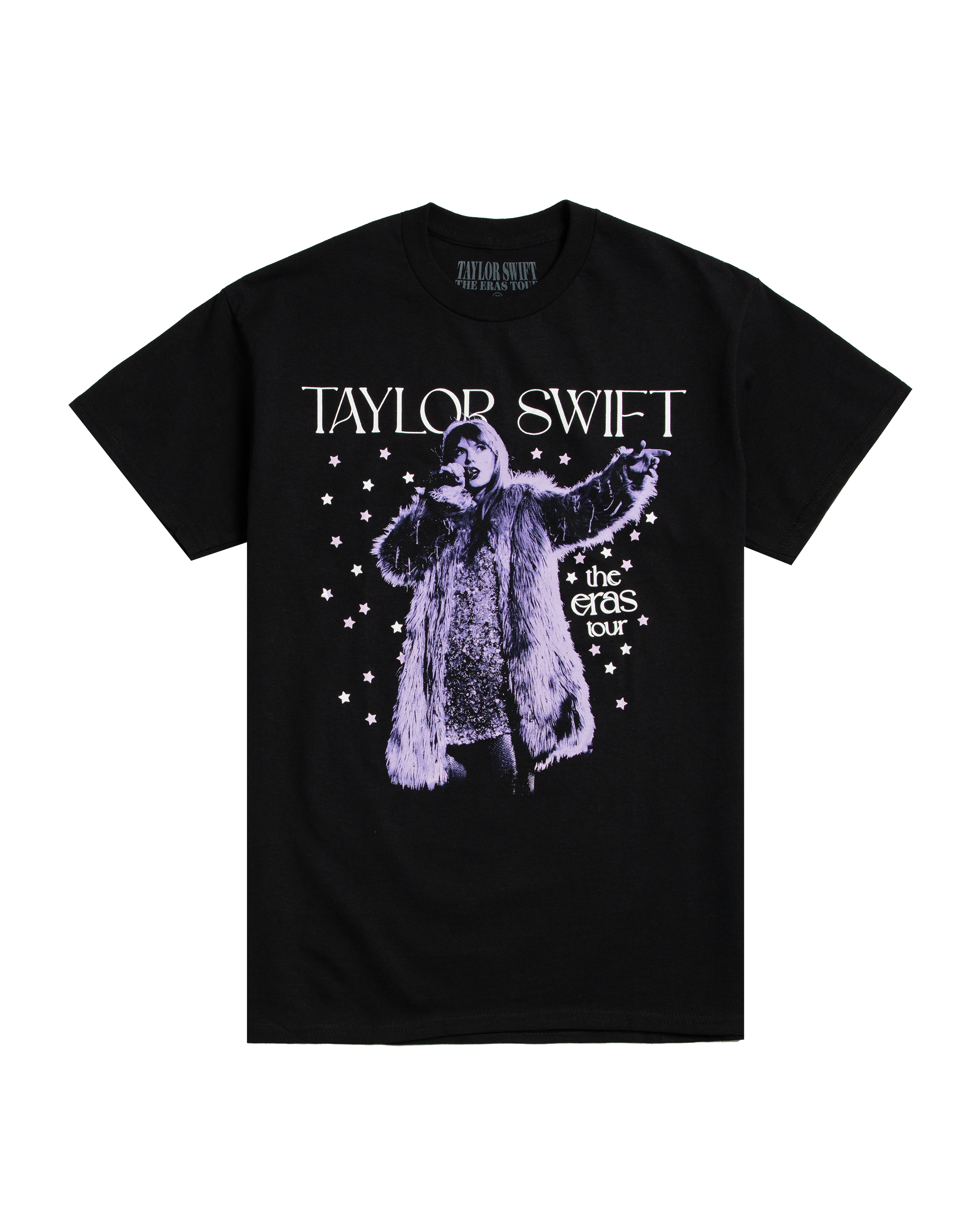 Black t-shirt featuring photo of Taylor Swift with stars design and Taylor Swift | The Eras Tour printed on front with Taylor Swift | The Eras Tour. tour locations. and star design printed on back.