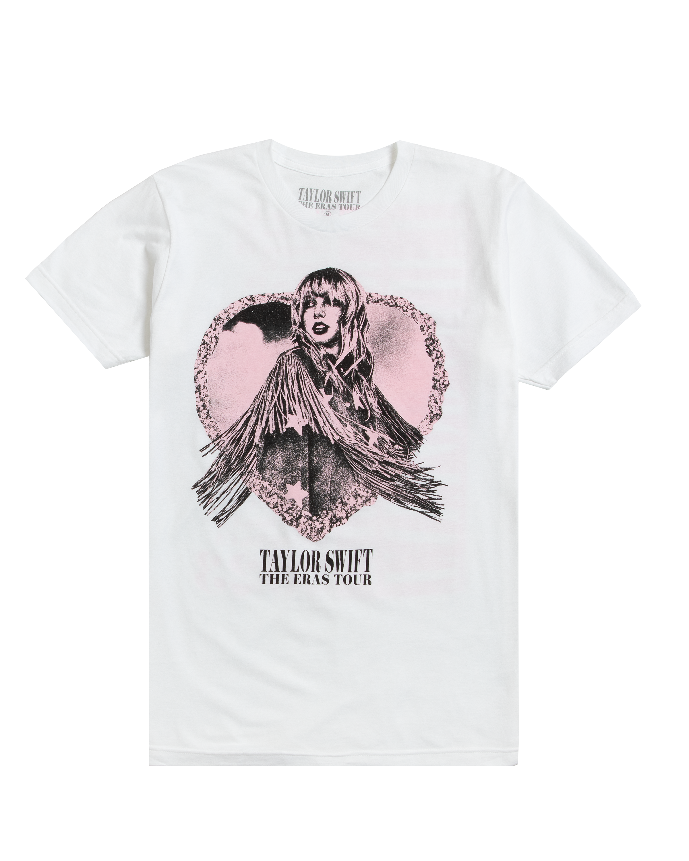 White t-shirt with Lover album era photo of Taylor Swift and Taylor Swift | The Eras Tour printed on front and Taylor Swift | The Eras Tour. tour locations. and 2023 printed on back.