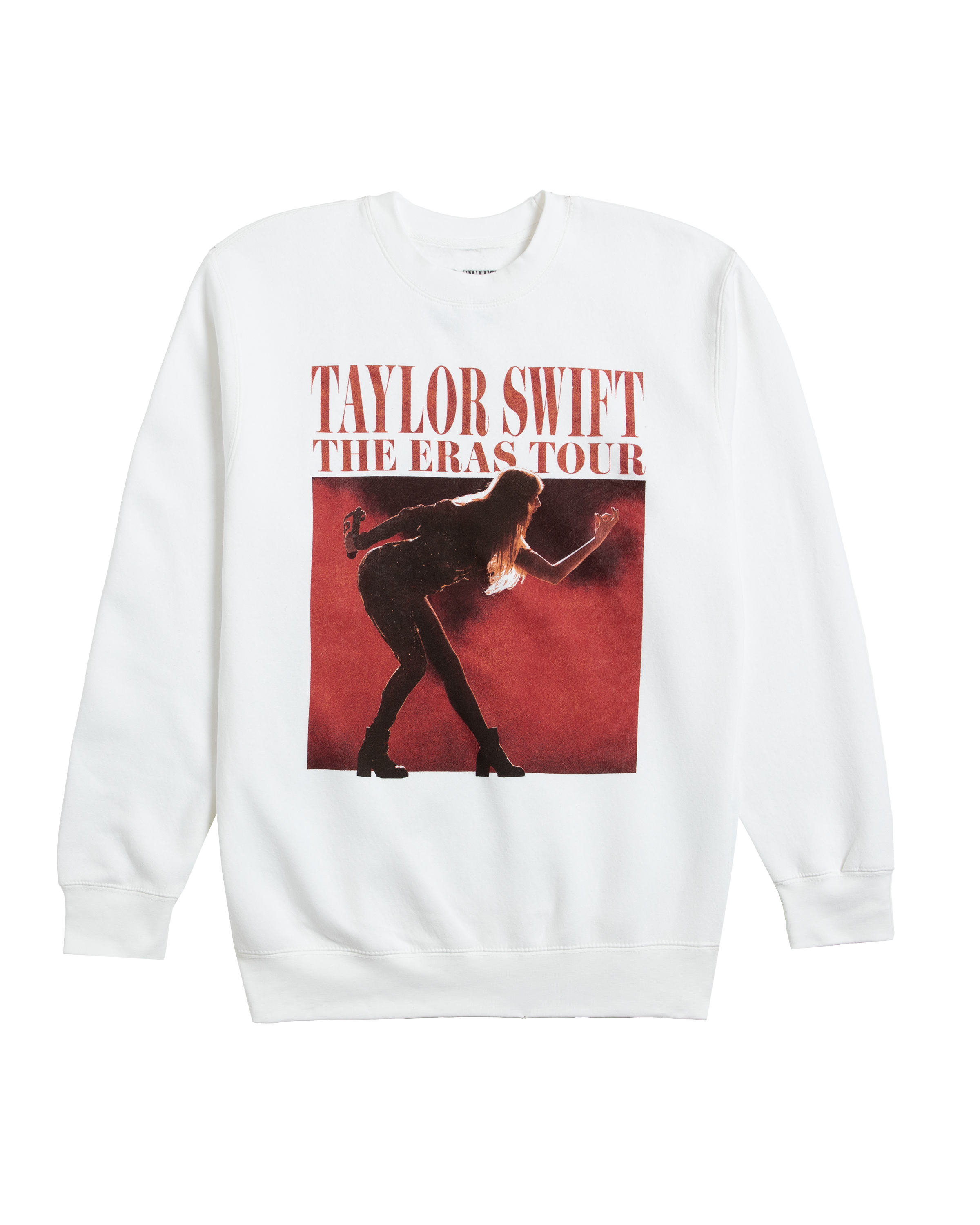 White crewneck featuring photo of Taylor Swift and Taylor Swift | The Eras Tour printed on front with Taylor Swift | The Eras Tour. tour locations. and Taylor Swift album titles printed on back.