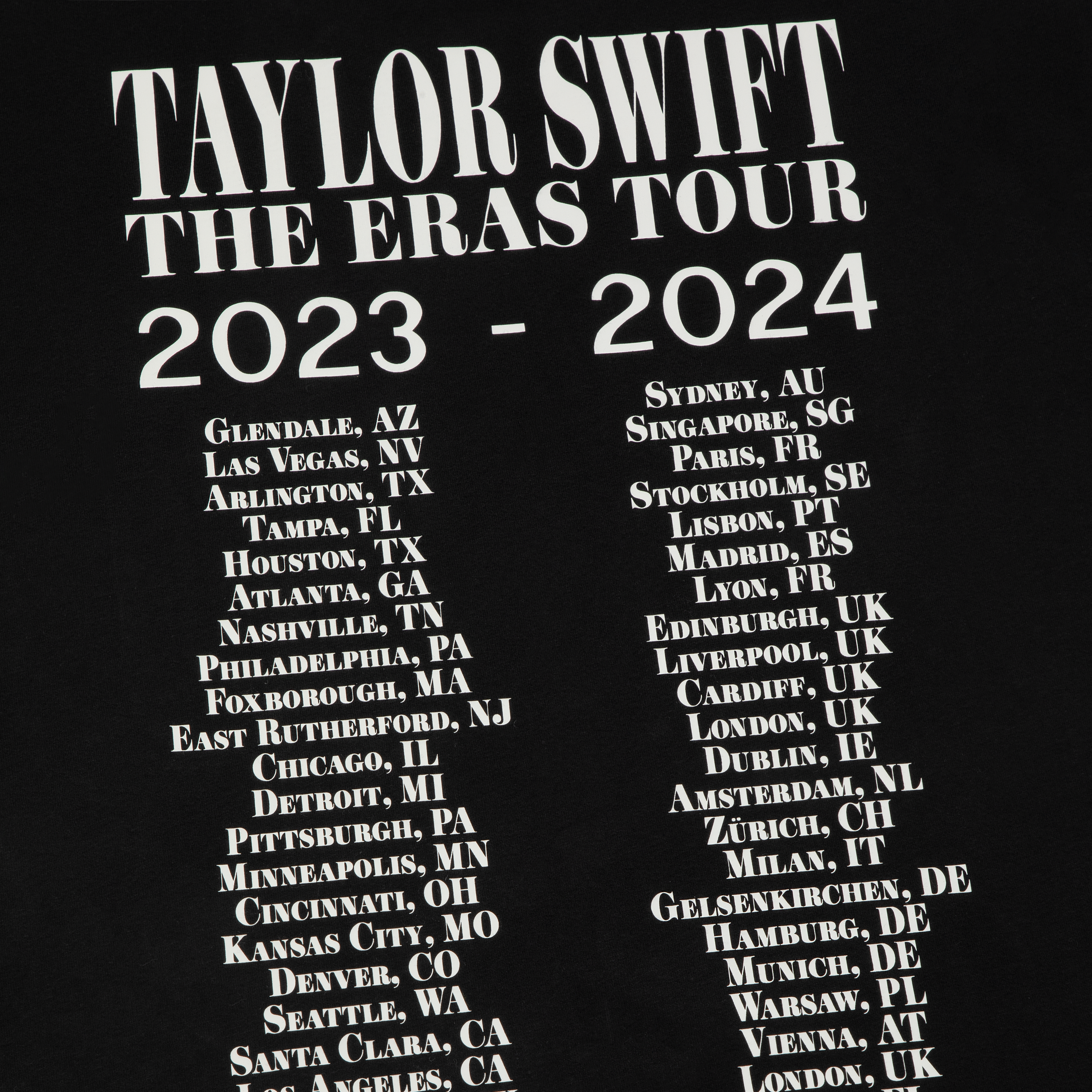 Black t-shirt featuring photos of Taylor Swift printed on front and Taylor Swift The Eras Tour printed on wearer’s left sleeve with Taylor Swift The Eras Tour 2023-2024 and tour locations printed on back.