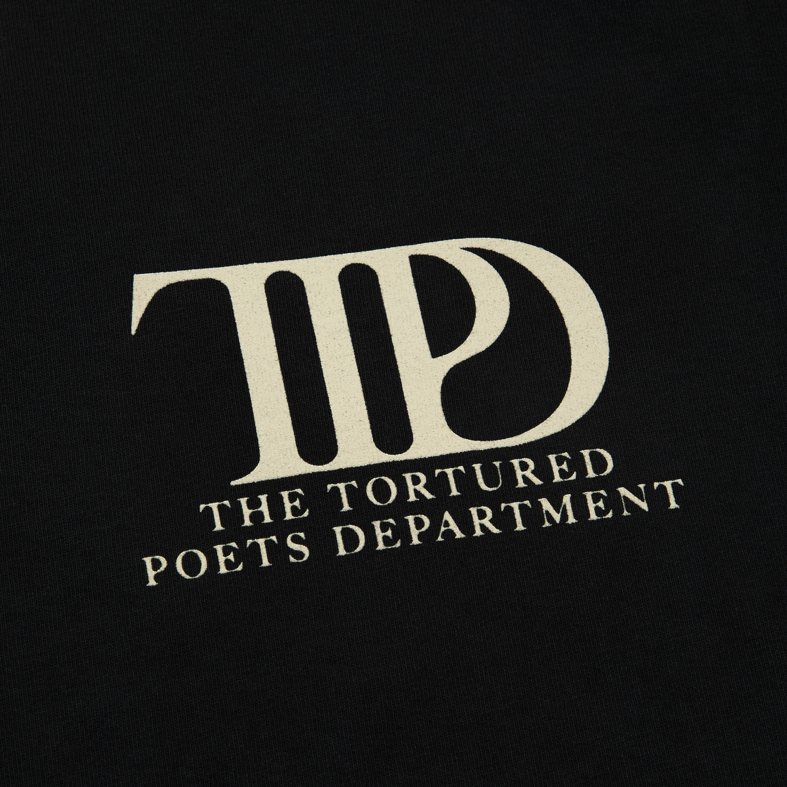 Black t-shirt featuring TTPD album logo and The Tortured Poets Department printed on front left chest with bottle design. Who Are We To Fight The Alchemy song lyrics. Taylor Swift and ©2024 printed on back.